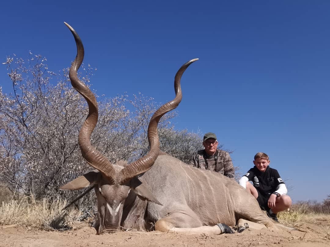 Packages are all inclusive and include guiding, lodging, pick up and drop off at Maun airport, all accommodations, all food, beer, wine and local spirits. Also includes all camp staff with a chef and daily laundry along with free rifle rental. Also trophy prep and delivery to Mochaba in Maun. Saves you a ton of money- no charters! Pricing is very reasonable with no sliding scale. If you are looking for a huge kudu bull they are very much present here. Below are pictures of a 62 ½” and 59 ½” taken by the same hunter in 2023. You would pay upwards of $8,000 or more as a trophy fee at most places!