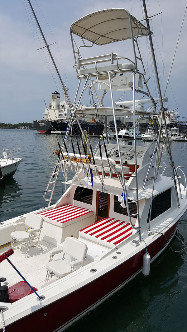 The most common boat fished in Guatemala is the famed 31 Bertram which is fast and maneuverable and provides more cockpit space due to its special layout for sport fishing than that of many boats greater than 40 feet or more. Here is what your boat looks like: