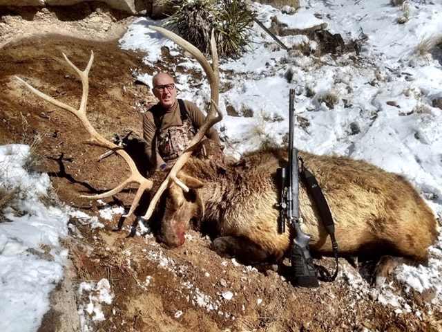 NOW LET’S BE REALISTIC – NOT EVERYONE WILL TAG A GIANT, AND NOT EVERYONE WILL EVEN KILL A BULL, but your odds are good here. Some units are muzzleloader or bow only, and some are rifle. DO NOT BE AFRAID OF THE MUZZLELOADER HUNTS- THEY CAN BE THE BEST OF ALL. IF WE LEARNED TO USE THEM, THEN BY GOLLY YOU SURE CAN TOO!! We can make suggestions to help you — and sometimes a guide may let you rent from him a set up. New Mexico allows scopes, sabots all the fixings and Butch’s wife Joan took one at 235 yards with a single shot few years back. Since then the weapons have gotten even better as have the range finding scopes. Just do it, you will not be sorry!! We at Hunt Nation have killed a number of muzzleloader bulls.
