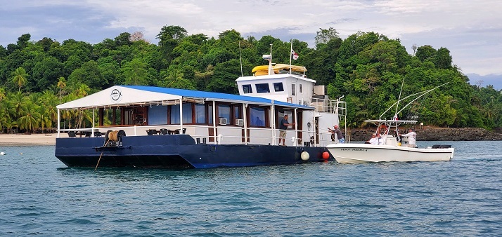 LODGING/MEALS: Guests stay aboard an 80′ floating lodge. This provides anglers with a clean and comfortable base camp. The mobility of the lodge allows you to travel to remote tropical settings where the fishing begins right at your front door. Newly renovated, the lodge can accommodate up to 16 guests. With four beds each, the four air-conditioned cabins share two clean bathrooms with hot-water showers and plenty of fresh water. Also to be enjoyed is a very comfortable, air-conditioned salon, as well as an on-the-water dining area running along the front of the lodge, complete with a friendly cash bar and bartender. Delicious Panamanian/American cuisine is prepared daily by chef Irina. Featured is the “catch of the day” served with fresh vegetables and tempting homemade desserts. Breakfast is coffee, local fruit, eggs, pancakes, cereal, bacon, sausage and toast. Lunch is on the fishing boats with sandwiches, snacks and fruit.